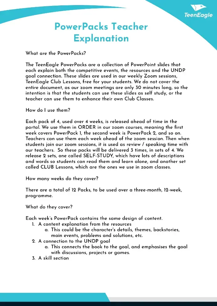 What It Is: TeenEagle Clubs are structured, weekly sessions that utilise our connected plans and materials. Students engage in interactive lessons and exciting activities, and at the end of the course, they can take our online round exam.