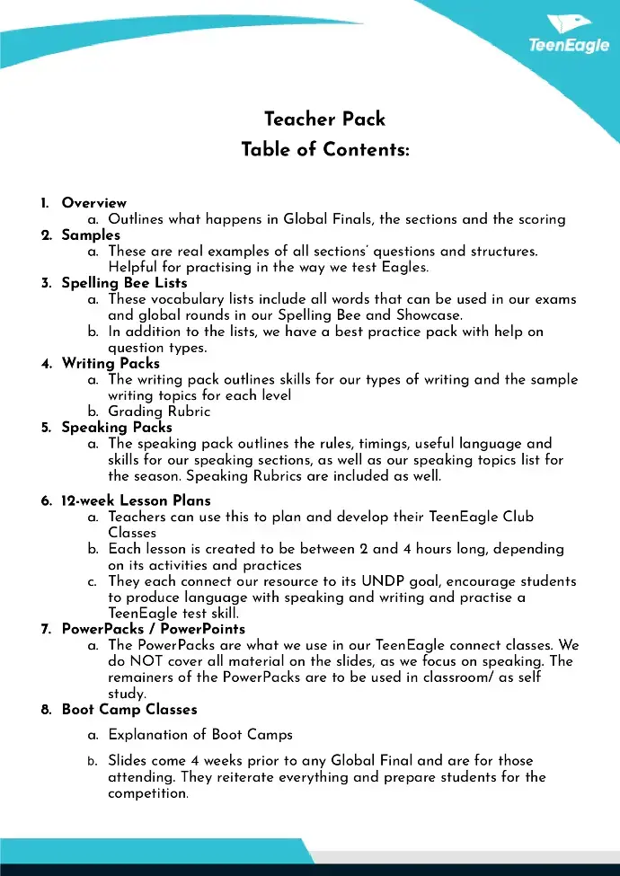 What It Is: TeenEagle Clubs are structured, weekly sessions that utilise our connected plans and materials. Students engage in interactive lessons and exciting activities, and at the end of the course, they can take our online round exam.